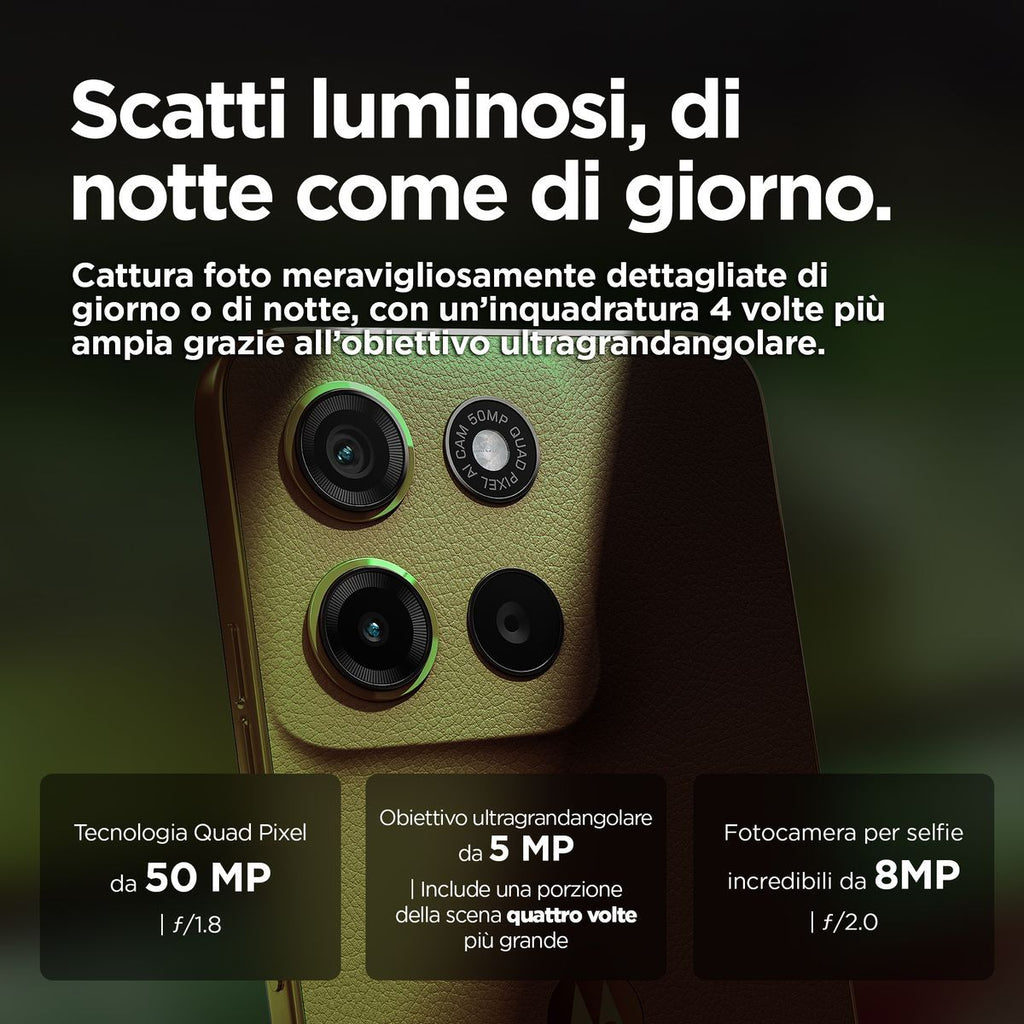 Motorola moto g15 . Dimensioni diagonale schermo: 17,1 cm (6.72"), Risoluzione del display: 2400 x 1080 Pixel. Frequenza del processore: 2 GHz, Famiglia processore: MediaTek, Modello del processore: Helio G81 Extreme. Capacità della RAM: 8 GB, Tipo di RAM: LPDDR4X, Capacità memoria interna: 256 GB. Risoluzione fotocamera posteriore (numerico): 50 MP, Tipo di fotocamera posteriore: Doppia fotocamera. Capacità della scheda SIM: Doppia SIM. Sistema operativo incluso: Android 15. Capacità della batteria: 5200 mAh. Colore del prodotto: Verde. Peso: 190 g
