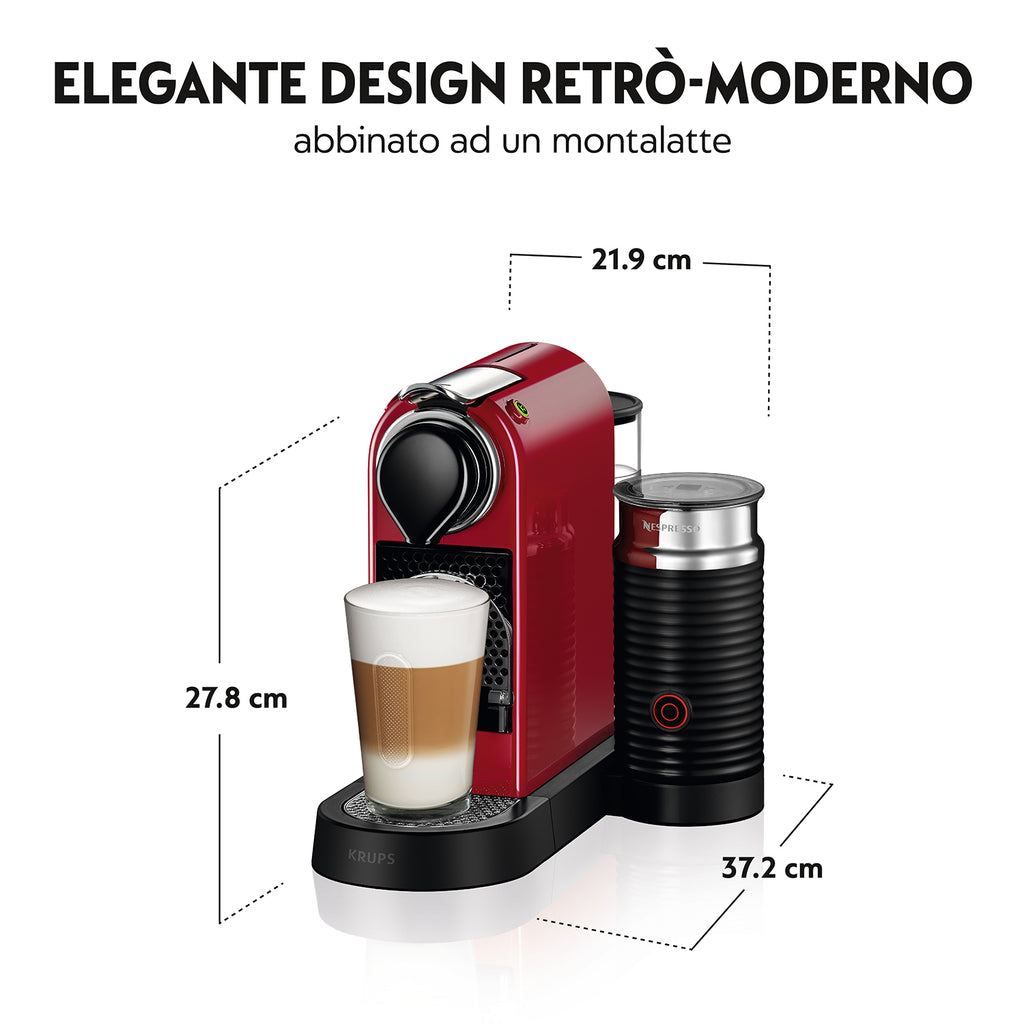 Con CitiZ&Milk, macchina caffè capsule, l'esperienza Nespresso incontra l'ispirazione rétro-moderna in una macchina compatta, intuitiva e facile da usare che si adatta a tutti i gusti in materia di caffè. Dotata di due pulsanti programmabili con arresto automatico di flusso per caffè espressi e lunghi e di Aeroccino integrato per preparare latte caldo e schiuma di latte, la macchina caffè capsule CitiZ&Milk è in grado di offrirti delle ricette di caffè saporite e perfettamente equilibrate. Goditi un caffè pronto in un attimo grazie alla pompa da 19 bar ad alte prestazioni e il riscaldamento rapido in soli 25 secondi. A completare il tutto un design intuitivo, funzione risparmio energetico automatica e serbatoio amovibile per pulirla facilmente.