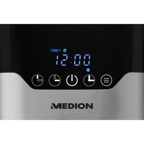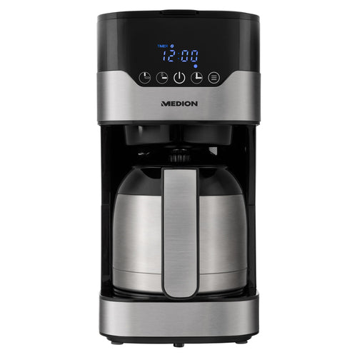 MEDION MD 18458. Tipo di prodotto: Macchina da caffè con filtro, Tipologia macchina del caffé: Automatica/Manuale, Capacità tanica acqua: 1,2 L, Tipologia di caffè utilizzato: Caffè macinato, Vaschetta per caffè preparato: Thermos, Capacità in tazze: 10 tazze. Potenza: 900 W. Colore del prodotto: Nero, Acciaio inox