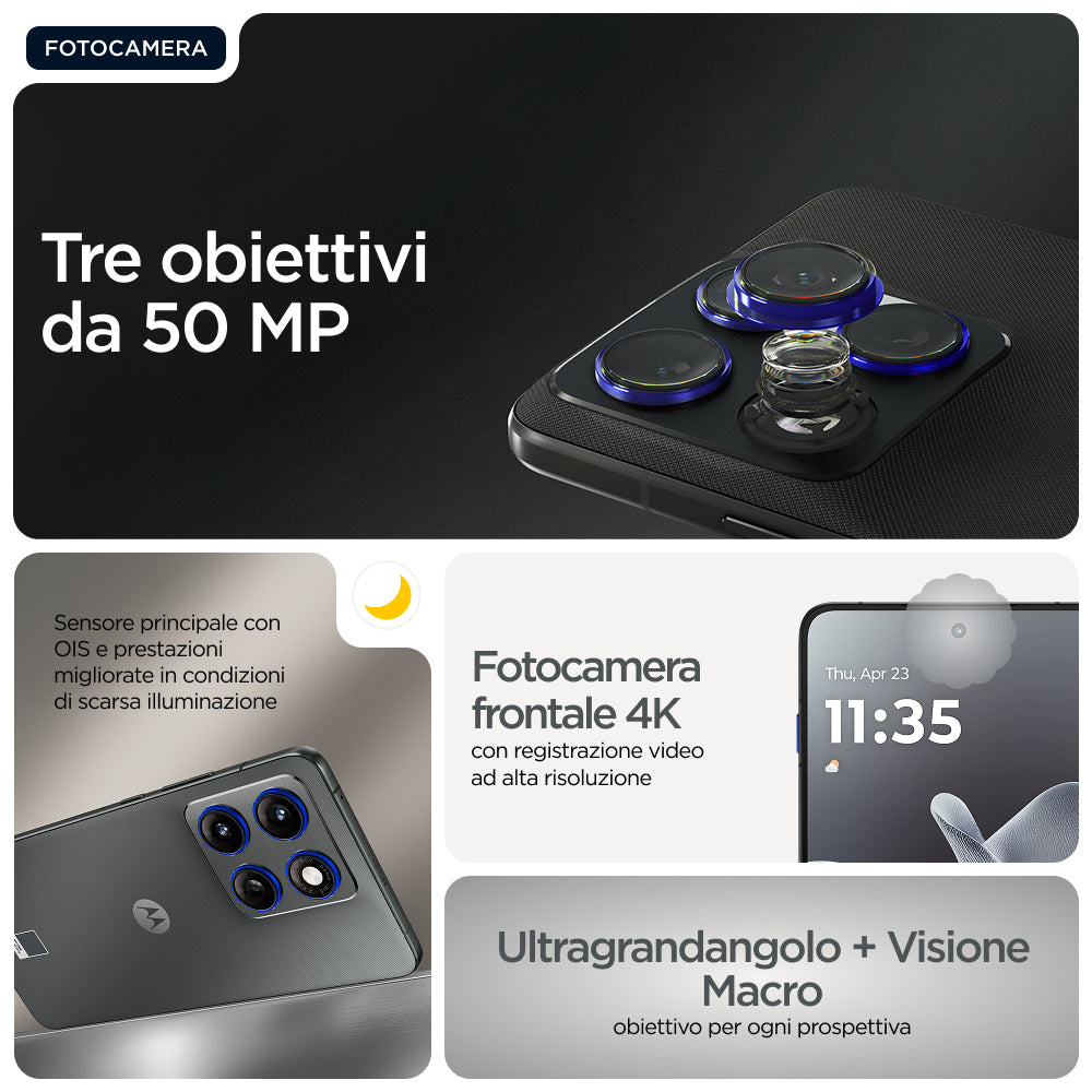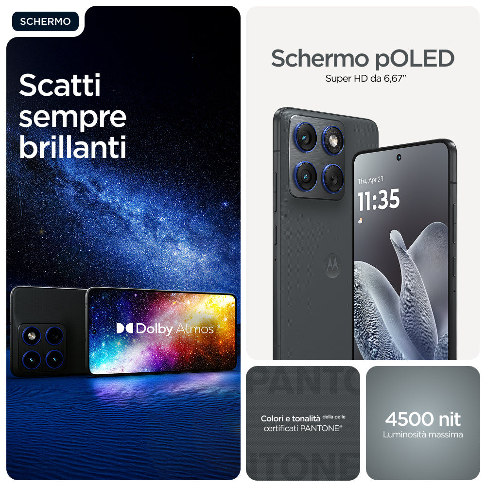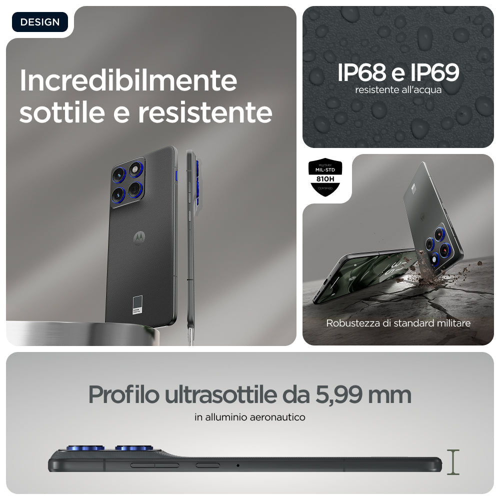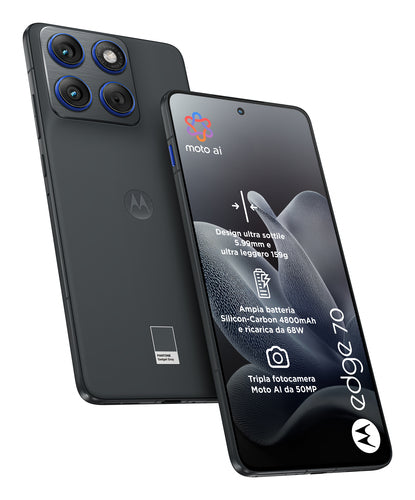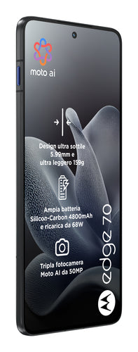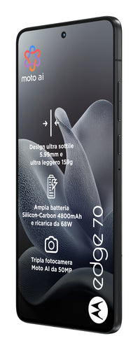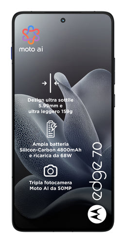 Ti presentiamo Motorola Edge 70, dal design ultra sottile 5.99mm e ultra leggero 159g con protezione avanzata Military Standard e resistenza IP68 e IP69. Scatta immagini eccezionali grazie al sistema di fotocamere da 50 MP OIS e ultragrandangolare. Goditi i contenuti sull’ampio display Super HD da 6,67”. La ricarica TurboPower™ da 68W fornisce autonomia rapidamente. Prova performance rapide ed efficienti con la batteria Silicon-Carbon da 4800mAh e il processore Qualcomm Snapdragon® 7 Gen 4. Con 12GB di RAM e 512GB di memoria.