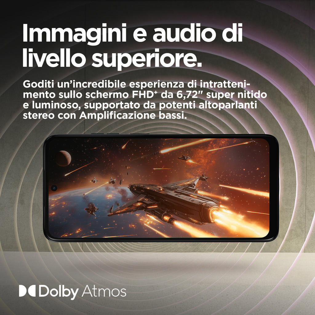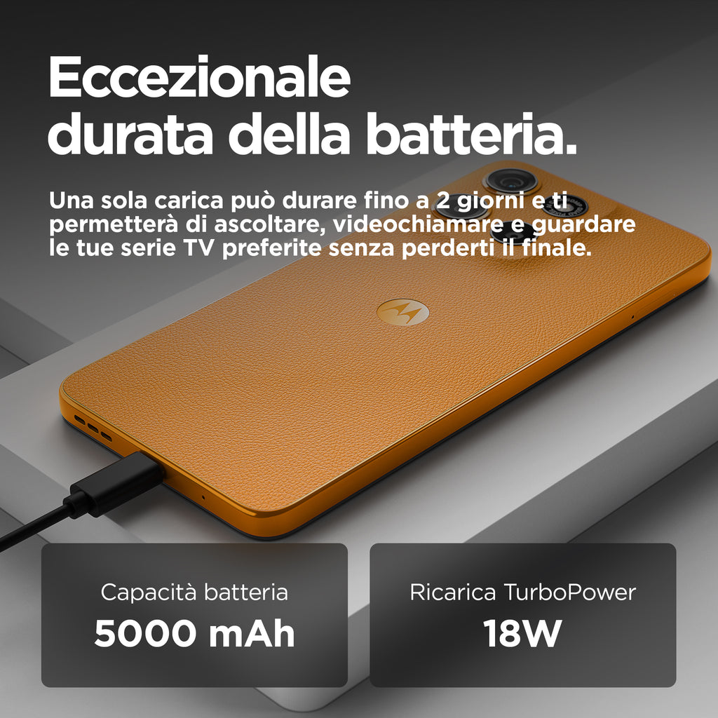 Moto g15 ti offre il meglio dell'intrattenimento cinematografico. Guarda i tuoi spettacoli e film preferiti su uno schermo Full HD+ da 6,72” sorprendentemente nitido e luminoso, anche all'aperto sotto la luce del sole. Ascolta un audio avvolgente grazie ai potenti altoparlanti stereo con Amplificazione bassi e Dolby Atmos®. Scatta foto straordinariamente dettagliate con il comparto fotografico da 50 MP(1) che elimina gli effetti fastidiosi causati dalle sorgenti di luce artificiali. Ricarica velocemente con la ricarica TurboPower™(2) e approfitta di un'autonomia maggiore con la batteria da 5200 mAh. Goditi il look raffinato del materiale premium vegano e la protezione offerta dal design idrorepellente(3) e da Corning® Gorilla® Glass 3. Inoltre, grazie alle prestazioni ultra rapide e all'ampia memoria di archiviazione, avrai sempre spazio per il divertimento. Illumina ogni giornata con Moto g15.