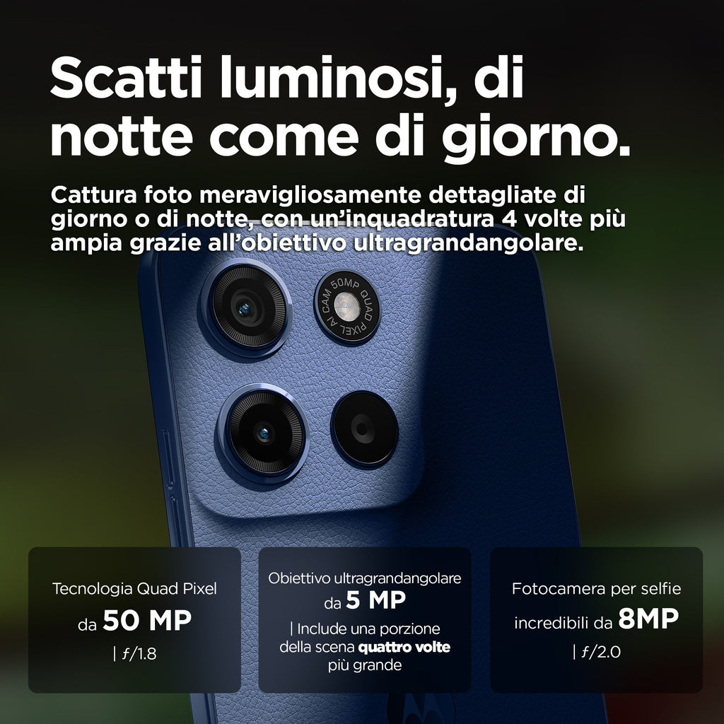 Moto g15 ti offre il meglio dell'intrattenimento cinematografico. Guarda i tuoi spettacoli e film preferiti su uno schermo Full HD+ da 6,72” sorprendentemente nitido e luminoso, anche all'aperto sotto la luce del sole. Ascolta un audio avvolgente grazie ai potenti altoparlanti stereo con Amplificazione bassi e Dolby Atmos®. Scatta foto straordinariamente dettagliate con il comparto fotografico da 50 MP(1) che elimina gli effetti fastidiosi causati dalle sorgenti di luce artificiali. Ricarica velocemente con la ricarica TurboPower™(2) e approfitta di un'autonomia maggiore con la batteria da 5200 mAh. Goditi il look raffinato del materiale premium vegano e la protezione offerta dal design idrorepellente(3) e da Corning® Gorilla® Glass 3. Inoltre, grazie alle prestazioni ultra rapide e all'ampia memoria di archiviazione, avrai sempre spazio per il divertimento. Illumina ogni giornata con Moto g15.