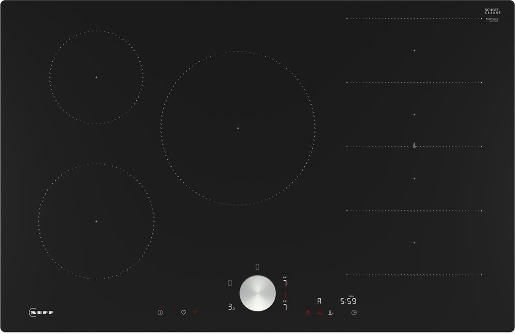 Neff T68PTV4L0. Colore del prodotto: Nero, Posizionamento dell'apparecchio: Da incasso, Dimensione della larghezza del piano cottura: 80 cm. Tipo di controllo: Touch, Posizione di controllo: Frontale, Tipo di timer: Digitale. Potenza aggregata (elettrica): 7400 W, Tensione di ingresso AC: 220 - 240 V, Frequenza di ingresso AC: 50/60 Hz. Larghezza: 792 mm, Profondità: 512 mm, Altezza: 56 mm. Larghezza imballo: 953 mm, Profondità imballo: 608 mm, Altezza imballo: 126 mm