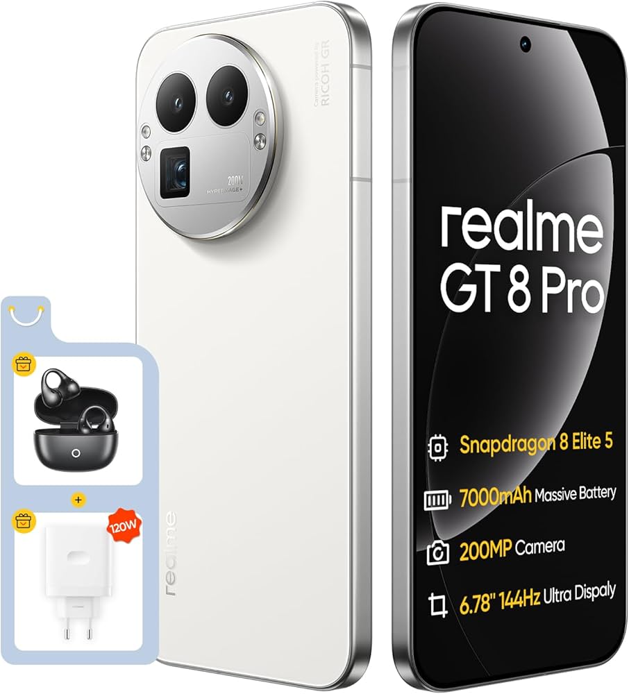 • Realme GT 8 Pro (Diary White) • Adattatore SUPERVOOC 100W+ • Cavo USB-C • Ago per SIM • Copertura protettiva pre-applicata • Manuali di istruzione |