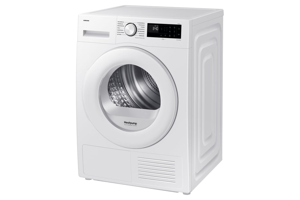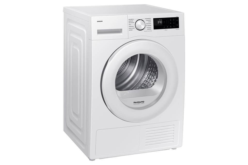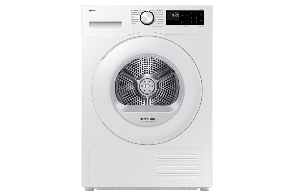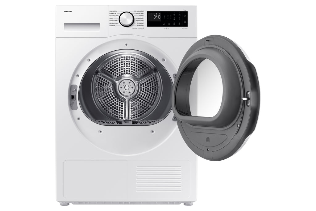 Samsung DV90DG52A0TE. Posizionamento dell'apparecchio: Libera installazione, Tipo di carica: Caricamento frontale, Sistema di asciugatura: Pompa di calore. Capacità cestello: 9 kg, Condensation efficiency class (old): B, Programmi di asciugatura: Coperta, Cotone, Delicati/Seta, Easy care, Eco, Ferro da stiro a secco, Cuscino, Rapido, Asciugamano. Consumo energetico: 1,54 kWh, Consumo energetico annuo: 194 kWh, Fonte di calore: Elettrico. Tecnologie Samsung (cura dei vestiti): OptimalDry™, SmartThings, Motore digitale a inverter, Hygiene Care. Profondità: 600 mm, Larghezza: 600 mm, Altezza: 850 mm