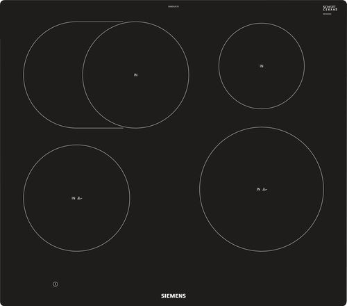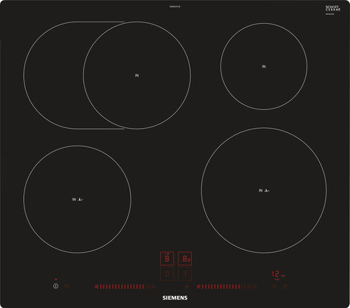 Siemens EH601LFC1E. Colore del prodotto: Nero, Posizionamento dell'apparecchio: Da incasso, Tipo di piano cottura: Piano cottura a induzione. Bruciatore piccolo: 1400 W, Bruciatore medio: 1800 W, Bruciatore grande: 2200 W. Tipo di controllo: Touch, Posizione di controllo: Frontale superiore. Potenza aggregata (elettrica): 7400 W, Tensione di ingresso AC: 220-240 V, Frequenza di ingresso AC: 50 - 60 Hz. Larghezza: 572 mm, Profondità: 512 mm, Altezza: 56 mm