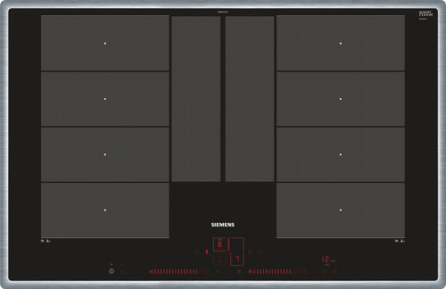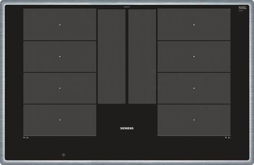 Siemens EX845LYC1E. Colore del prodotto: Nero, Acciaio inox, Posizionamento dell'apparecchio: Da incasso, Tipo di piano cottura: Piano cottura a induzione. Bruciatore piccolo: 2200 W, Bruciatore medio: 2200 W, Bruciatore grande: 2200 W. Tipo di controllo: Touch. Potenza aggregata (elettrica): 7400 W, Tensione di ingresso AC: 220-240 V, Frequenza di ingresso AC: 50 - 60 Hz. Larghezza: 795 mm, Profondità: 55 mm, Altezza: 517 mm