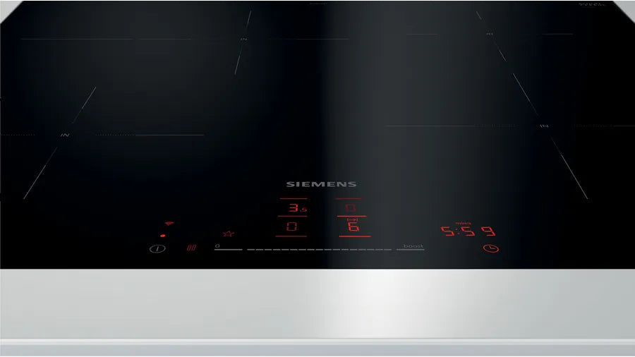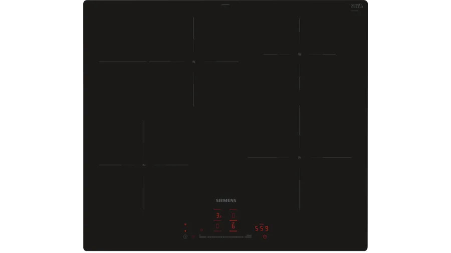 Siemens iQ300 EH601HFB1E. Colore del prodotto: Nero, Posizionamento dell'apparecchio: Da incasso, Dimensione della larghezza del piano cottura: 60 cm. Tipo di controllo: Touch, Posizione di controllo: Frontale superiore, Tipo di orologio: Elettronico. Potenza aggregata (elettrica): 7400 W, Tensione di ingresso AC: 220 - 240 V, Frequenza di ingresso AC: 50/60 Hz. Larghezza: 572 mm, Profondità: 512 mm, Altezza: 56 mm. Larghezza imballo: 750 mm, Profondità imballo: 600 mm, Altezza imballo: 130 mm