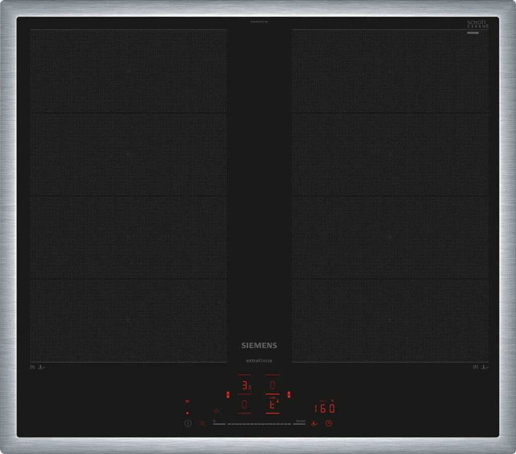 Siemens iQ700 EX645HXC1E. Colore del prodotto: Nero, Posizionamento dell'apparecchio: Da incasso, Dimensione della larghezza del piano cottura: 60 cm. Tipo di controllo: Touch, Posizione di controllo: Frontale, Tipo di orologio: Elettronico. Potenza aggregata (elettrica): 7400 W, Tensione di ingresso AC: 220 - 240 V, Frequenza di ingresso AC: 50/60 Hz. Tecnologie Siemens (cottura): Home Connect, roastingSensor Plus, touchSlider. Larghezza: 583 mm, Profondità: 55 mm, Altezza: 513 mm