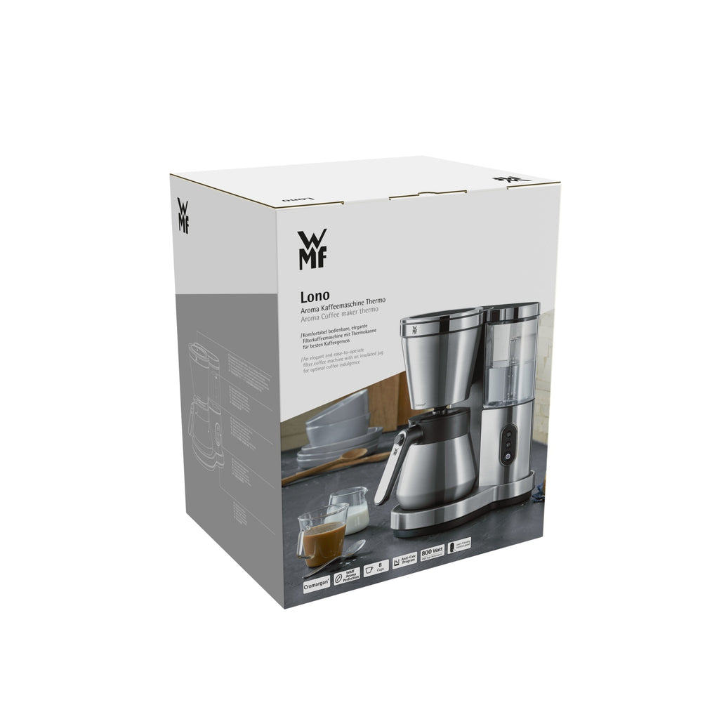 WMF Lono 0412310011. Tipo di prodotto: Macchina da caffè con filtro, Tipologia macchina del caffé: Automatica/Manuale, Capacità tanica acqua: 1 L, Tipologia di caffè utilizzato: Caffè macinato, Capacità in tazze: 8 tazze. Potenza: 800 W. Colore del prodotto: Nero, Argento